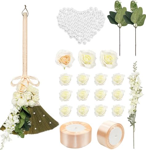 Bride And Groom Wedding Broom Jumping Ceremony,DIY Wedding Broom,Wedding Decoration Jumping Broom With Ribbon Artificial Pearls Rose Delphinium Leaves