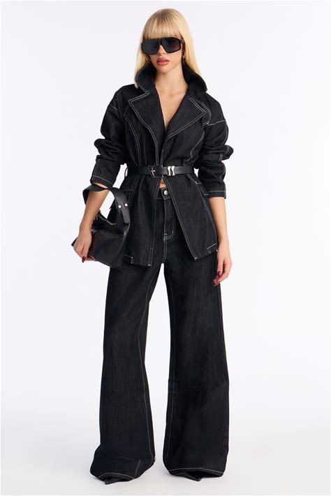 Long Sleeve Denim Blazer Wide Leg Pant Set In Dark Denim, Size M For Streetwear | Fashion Nova