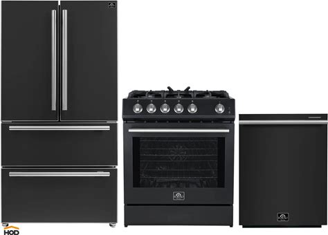 Forno 4-Piece Appliance Package - 36-Inch Gas Range, Wall Mount Range Hood, 36-Inch French Door Refrigerator, And Dishwasher In Black With Antique Brass Handle