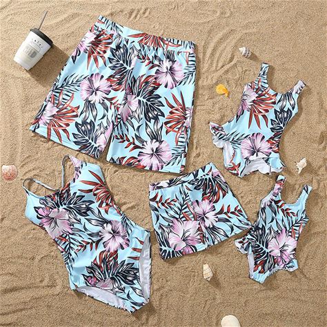 Family Swimsuit Jumpsuit Floral Graphic Casual Ruched Blue Sleeveless Active Matching Outfits