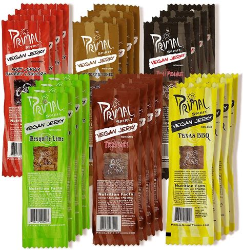 Primal Spirit Vegan Jerky - Sampler Pack, 10G. Plant Based Protein, Certified Non-GMO ("Classics" Thai Peanut, Mesquite Lime, Teriyaki, Hot & Spicy,