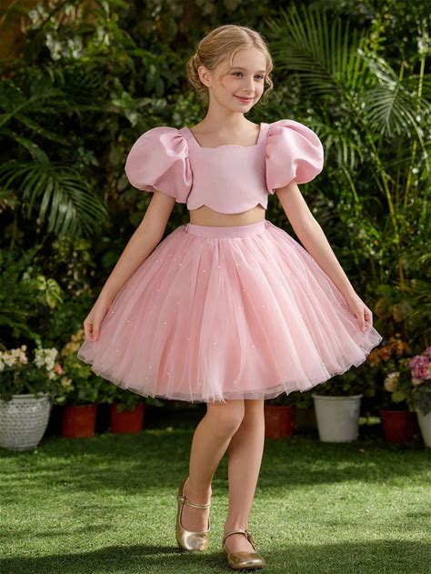 Tween Girl Pink Petal Sleeve Tulle Party Dress 2 Pieces Set, Girls Birthday Party, Wedding, Prom, Flower Girl, Bridesmaid, Holiday Celebration, Graduation Dress, Casual Wear,9Y